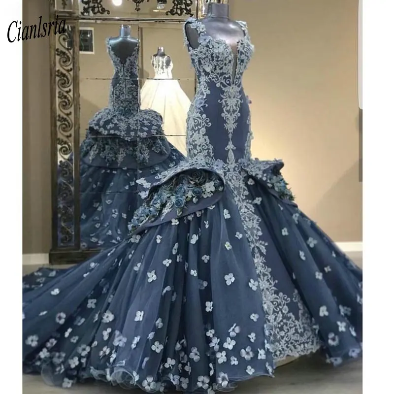 Special Offer فستان حورية البحر الفاخر باللون الأزرق الداكن 2020 مع الزهور الصناعية فساتين الحفلات الرسمية رداء السهرة Discount 20% Today!